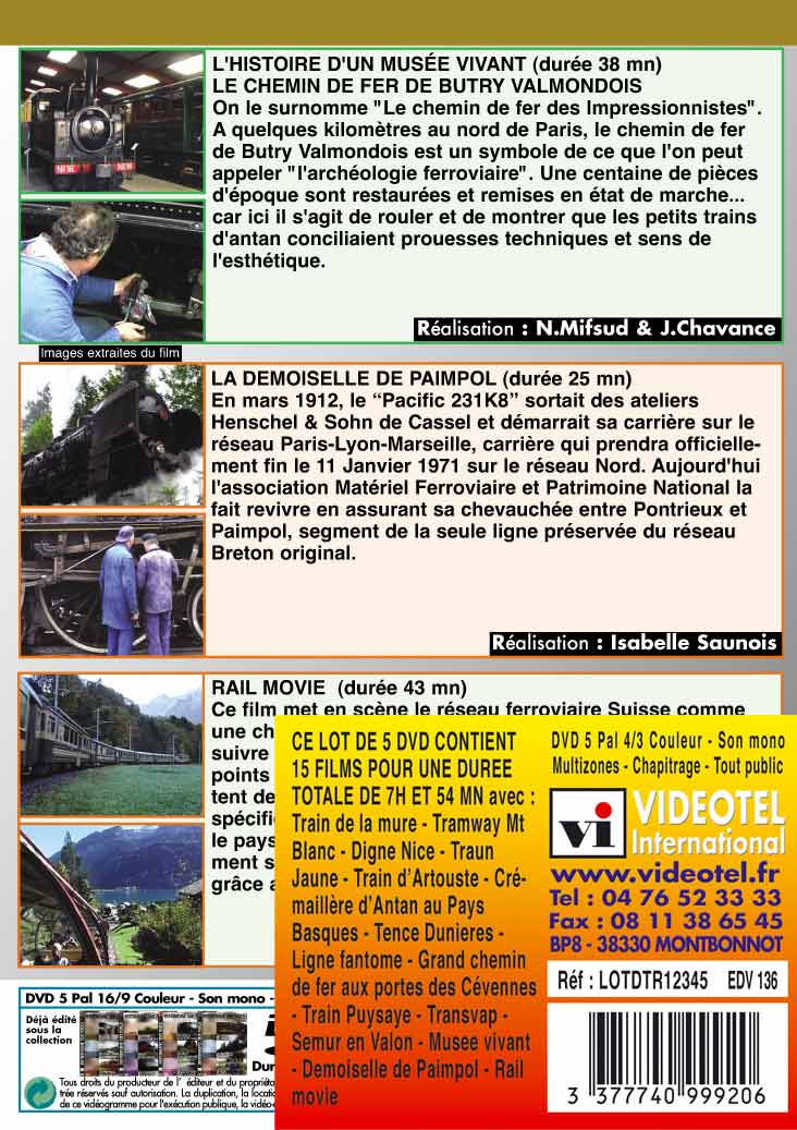 UN SIECLE D’ASCENSION FERROVIAIRE Le tramway du Mont Blanc (32mn Olivier Jehan) - HISTOIRE(S) D’UN PETIT TRAIN Nice à Digne-les-Bains (47mn Isabelle Saunois) - TRAVAILLEURS DU TRAIN JAUNE (56mn Isabelle Saunois) - LE TRAIN D’ARTOUSTE (22mn Isabelle Saunois) -LA CRÉMAILLÈRE D’ANTAN DU PAYS BASQUES FRANCAIS Chemin de fer de la Rhune (20 mn film d’Isabelle Saunois) - UN PETIT TRAIN SUR LES RAILS DE L’HISTOIRE La ligne Tence Dunière (23 mn Jacquie Chavance) - LA LIGNE FANTÔME (48mn Isabelle Saunois) - UN GRAND CHEMIN DE FER AUX PORTES DES CÉVENNES Anduze/Saint Jean du Gard. (27 mn Eric Beauducel) - BALADE EN TRAIN DANS LE PUYSAYE La ligne de Toucy St Benoit (20mn Nicolas Mifsud et Jacquie Chavance) - LES COPAINS DE LA TRANSVAP La ligne Connère Bonnetable (23mn Nicolas Doyard) - NAISSANCE D’UNE LIGNE Le Chemin de fer de Semur en Vallon (23mn Jacquie Chavance) - L’HISTOIRE D’UN MUSÉE VIVANT : Le Chemin de fer de Butry Valmondois (38mn Nicolas Mifsud et Jacquie Chavance) - LA DEMOISELLE DE PAIMPOL (25mn Isabelle Saunois) - RAIL MOVIE (43mn Nicolas Doyard)