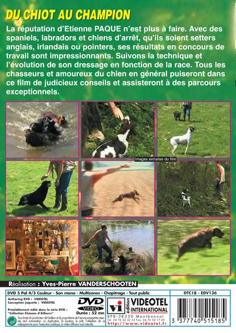 La réputation d’Etienne PAQUE n’est plus à faire. Avec des Spaniels, labradors et chiens d’arrêt, qu’ils soient setters anglais, irlandais ou pointers, ses résultats en concours de travail sont impressionnants. Suivons la technique et l’évolution de son dressage en fonction de la race. Tous les chasseurs et amoureux du chien en général puiseront dans ce film de judicieux conseils et assisteront à des parcours exceptionnels.