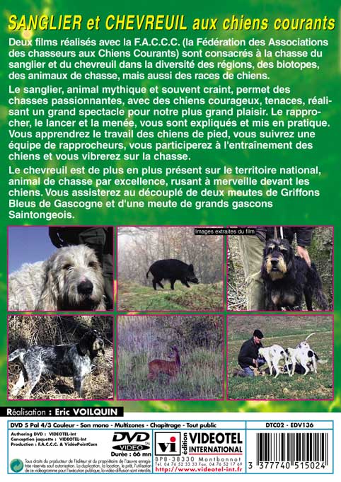 Deux films réalisés avec la F.A.C.C.C. (la Fédération des Associations des chasseurs aux Chiens Courants) sont consacrés à la chasse du sanglier et du chevreuil dans la diversité des régions, des biotopes, des animaux de chasse, mais aussi des races de chiens.