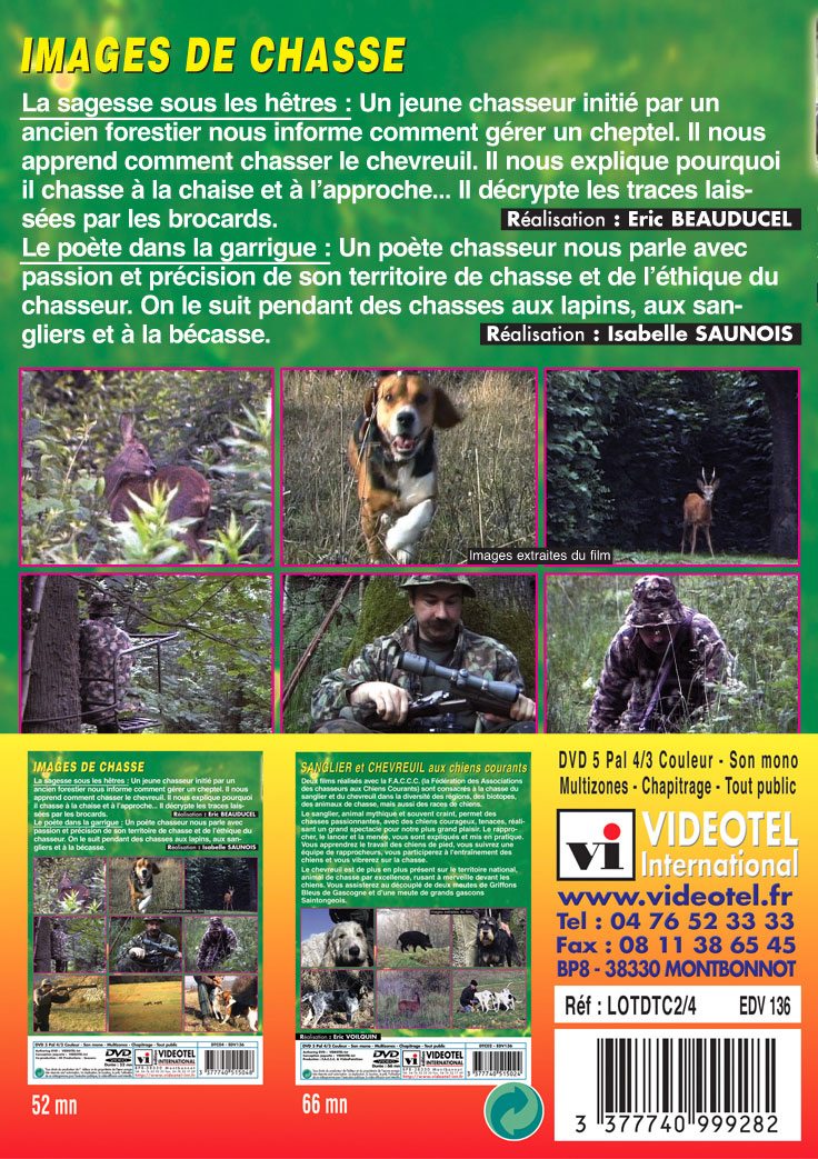 IMAGES DE CHASSE Sangliers, Chevreuils Lièvres. Deux films : LA SAGESSE SOUS LES HETRES : Un jeune chasseur initié par un ancien forestier nous informe comment gérer un cheptel. Il nous apprend comment chasser le chevreuil. Il nous explique pourquoi il chasse à la chaise et à l’approche.. Il décrypte les traces laissées par les brocards. LE POETE DANS LA GARRIGUE : Un poète chasseur nous parle avec passion et précision de son territoire de chasse et de l’éthique du chasseur. On le suit pendant des chasses aux lièvres, aux sangliers et à la bécasse.