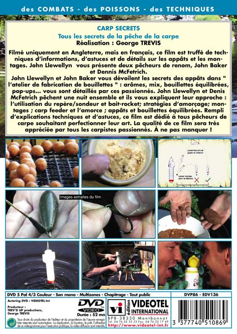 Filmé uniquement en Angleterre, mais en français, ce film est truffé de techniques d’informations, d’astuces et de détails sur les appâts et les montages. John Llewellyn vous présente deux pêcheurs de renom, John Baker et Dennis McFetrich. John Llewellyn et John Baker vous dévoilent les secrets des appâts dans l’atelier de fabrication de bouillettes : arômes, mix, bouillettes équilibrées, pop-ups… vous sont détaillés par ces passionnés. John Llewellyn et Denis McFetrich pêchent une nuit ensemble et ils vous expliquent leur approche : l’utilisation du repère/sondeur et bait-rocket; stratégies d’amorçage; montages; carp feeder et l’amorce ; appâts et bouillettes équilibrées. Rempli d’explications techniques et d’astuces, ce film est dédié à tous pêcheurs de carpe souhaitant perfectionner leur art. La qualité de ce film sera très appréciée par tous les carpistes passionnés. À ne pas manquer !