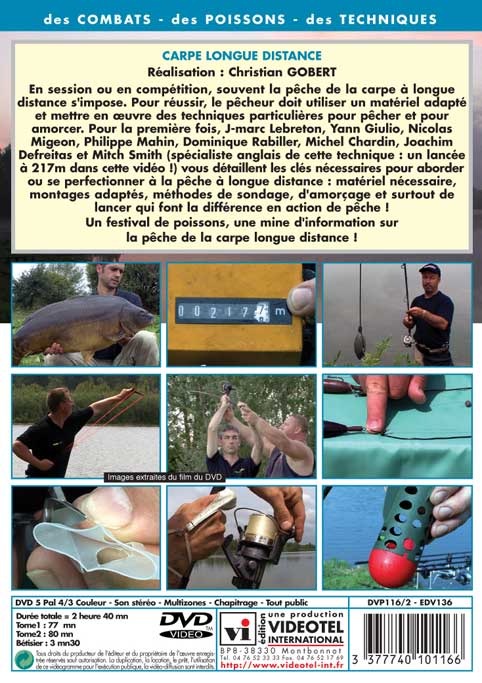 En session ou en compétition, souvent la pêche de la carpe à longue distance s’impose. Pour réussir, le pêcheur doit utiliser un matériel adapté et mettre en œuvre des techniques particulières pour pêcher et pour amorcer. Pour la première fois, J-marc Lebreton, Yann Giulio, Nicolas Migeon, Philippe Mahin, Dominique Rabiller, Michel Chardin, Joachim Defreitas et Mitch Smith (spécialiste anglais de cette technique : un lancée à 217m dans cette vidéo !) vous détaillent les clés nécessaires pour aborder ou se perfectionner à la pêche à longue distance : matériel nécessaire, montages adaptés, méthodes de sondage, d’amorçage et surtout de lancer qui font la différence en action de pêche !