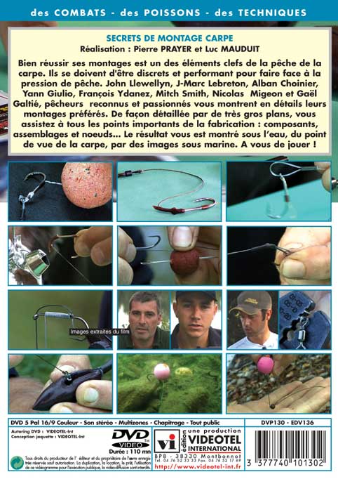 Bien réussir ses montages est un des éléments clefs de la pêche de la carpe. Ils se doivent d’être discrets et performant pour faire face à la pression de pêche. John Llewellyn, J-Marc Lebreton, Alban Choinier, Yann Giulio, François Ydanez, Mitch Smith, Nicolas Migeon et Gaël Galtié, pêcheurs reconnus et passionnés vous montrent en détails leurs montages préférés. De façon détaillée par de très gros plans, vous assistez à tous les points importants de la fabrication : composants, assemblages et noeuds... Le résultat vous est montré sous l’eau, du point de vue de la carpe, par des images sous marine. A vous de jouer !