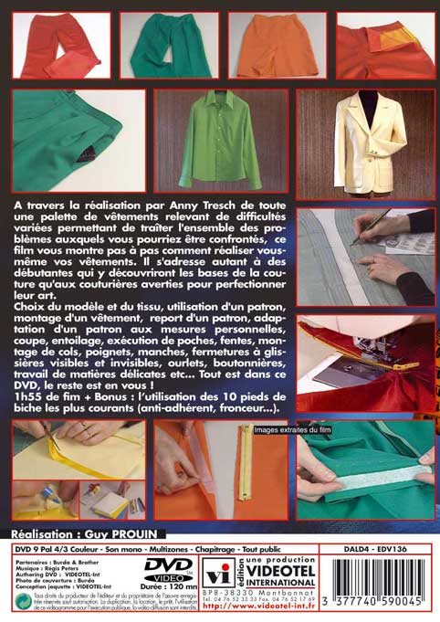 A travers la réalisation par Anny Tresch de vêtements variés permettant de voir l’ensemble des problèmes auxquels vous pourriez être confrontés, ce film vous montre pas à pas comment réaliser vous-même vos vêtements. Il s’adresse autant à des débutantes qu’aux couturières averties pour se perfectionner.\r\nChoix du modèle et du tissu, utilisation d’un patron, montage d’un vêtement, report d’un patron, adaptation d’un patron aux mesures personnelles, coupe, entoilage, exécution de poches, fentes, montage de cols, poignets, manches, fermetures à glissières visibles et invisibles, ourlets, boutonnières, travail de matières délicates etc... Tout est dans ce film, le reste est en vous !\r\n1h55 de film + Bonus : l’utilisation des 10 pieds de biche les plus courants (anti-adhérent, fronceur...).