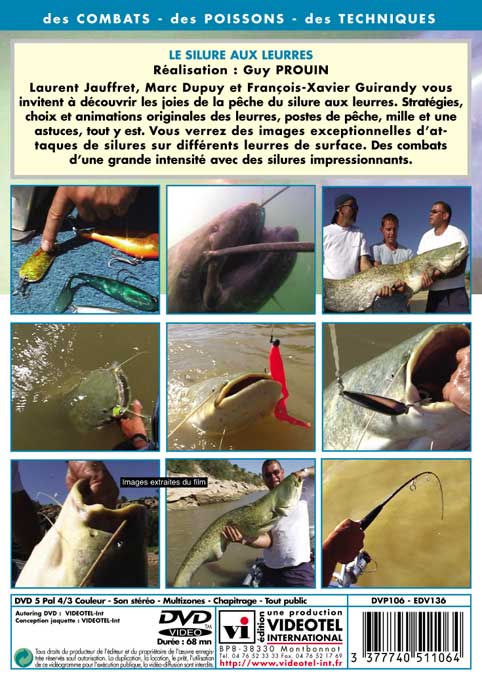 Laurent Jauffret, Marc Dupuy et François-Xavier Guirandy vous invitent à découvrir les joies de la pêche du silure aux leurres. Stratégies, choix et animations originales des leurres, postes de pêche, mille et une astuces, tout y est. Vous verrez des images exceptionnelles d’attaques de silures sur différents leurres de surface. Des combats d’une grande intensité avec des silures impressionnants.