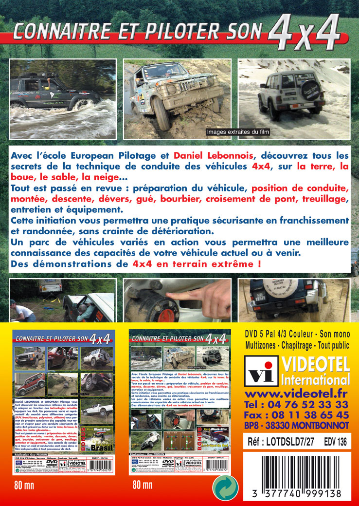 Connaitre et Piloter son 4x4 n°2 : Daniel Lebonnois et European Pilotage vous font découvrir les nouveaux réflexes de conduite du 4x4 à adopter en fonction des technologies actuelles. Un pano-rama des différentes catégories (SUV, franchisseur, polyva-lent, utilitaire) vous permet d’opter pour une conduite sécuri-sante de votre 4x4 sur terre, boue, sable, routes glissantes...