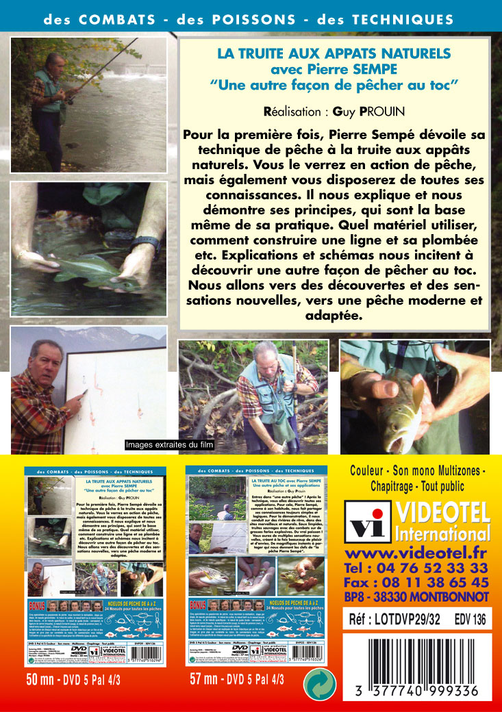 Pour la première fois, Pierre Sempé dévoile sa technique de pêche à la truite aux appâts naturels. Vous le verrez en action de pêche, mais également vous disposerez de toutes ses connaissances. Il nous explique et nous démontre ses principes, qui sont la base même de sa pratique. Quel matériel utiliser, comment construire une ligne et sa plombée etc. Explications et schémas nous incitent à découvrir une autre façon de pêcher au toc. Nous allons vers des découvertes et des sensations nouvelles, vers une pêche moderne et adaptée.